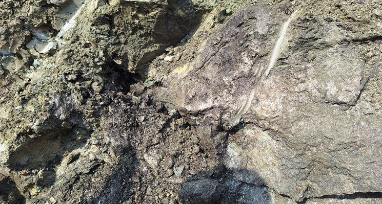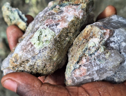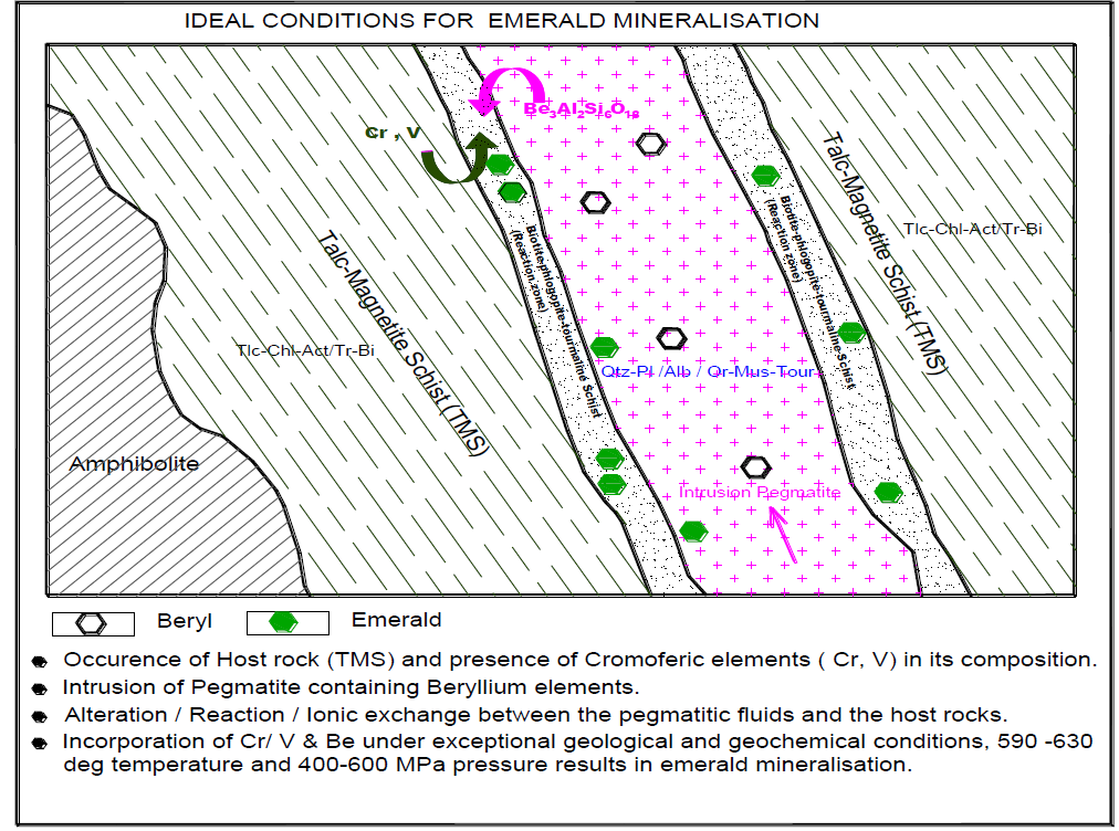 Emerald mineralization in Zambia is the result of a metasomatic reaction between metabasite units ( Talc Magnetite Schist) carrying chromium and pegmatite intrusions carrying beryllium. This result also forms an alteration unit called Biotite Phlogopite Schist, which acts as a host rock for emerald mineralization, as exhibited at EKS plot 257A.