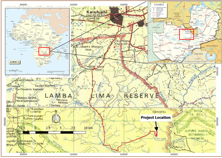 EKS Mining International Ltd emerald mine (active) with license number 19413-HQ-SML is located 25 km southwest of Kitwe, in the Copperbelt Province of Zambia, and is situated between the Chantete and Kafue Rivers. Access to the site is by a 15km-tarred M7 road from Kitwe to Kalulushi town and then by a 30km well-maintained gravel road to the mine site. Within the mining area itself, a number of motor-able tracks lead to the individual mining properties.